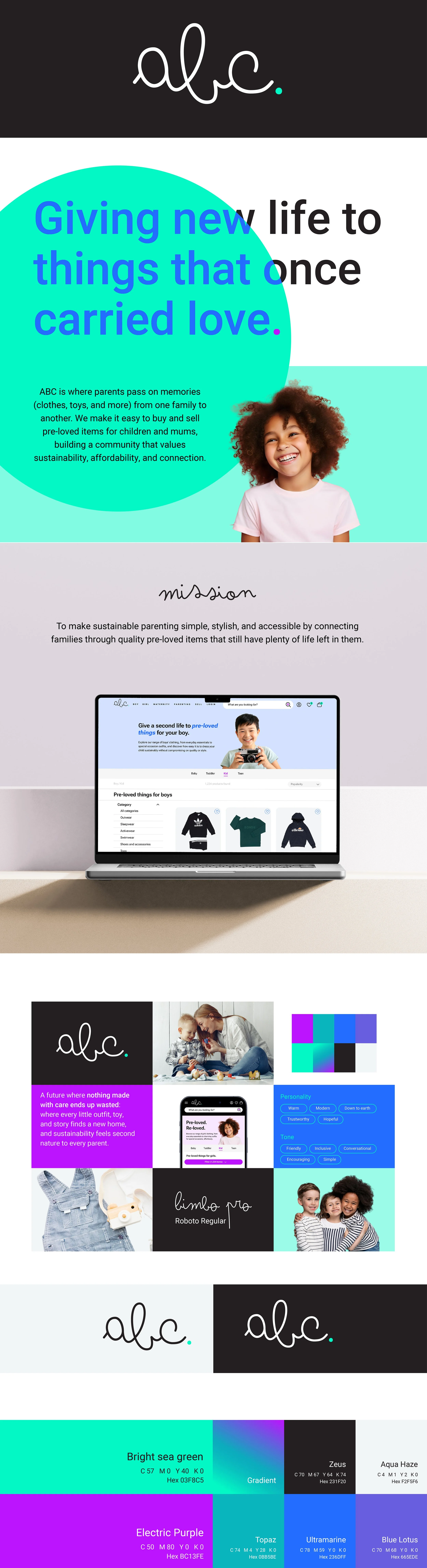 ABC is a branding project for a community-driven e-commerce platform dedicated to pre-loved items for children and mums. Built around the idea of giving products a second life, the brand promotes a more conscious way of parenting: where sustainability, affordability, and community come together.