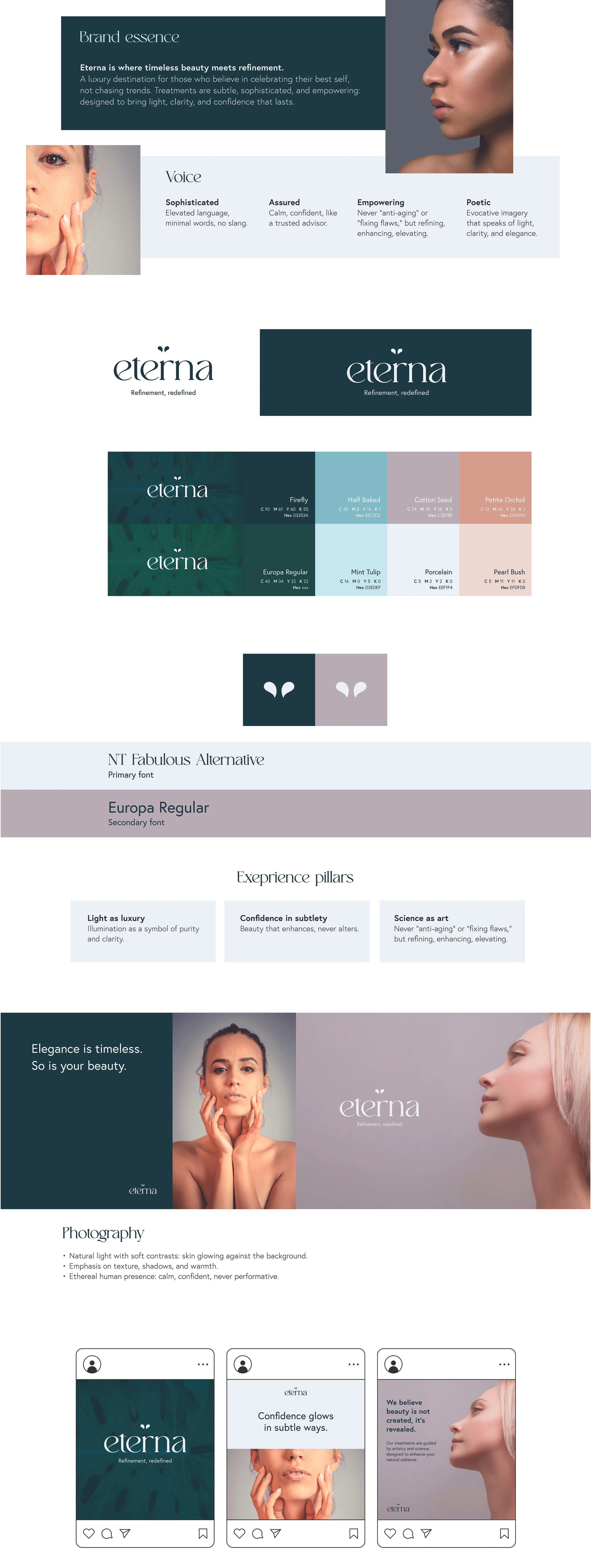 The brand positioning centres on the idea of timeless beauty: shifting the narrative from “anti-ageing” to confidence, continuity, and natural evolution. The name Eterna reflects longevity, elegance, and emotional reassurance, while the brand voice communicates with calm authority and quiet sophistication.
