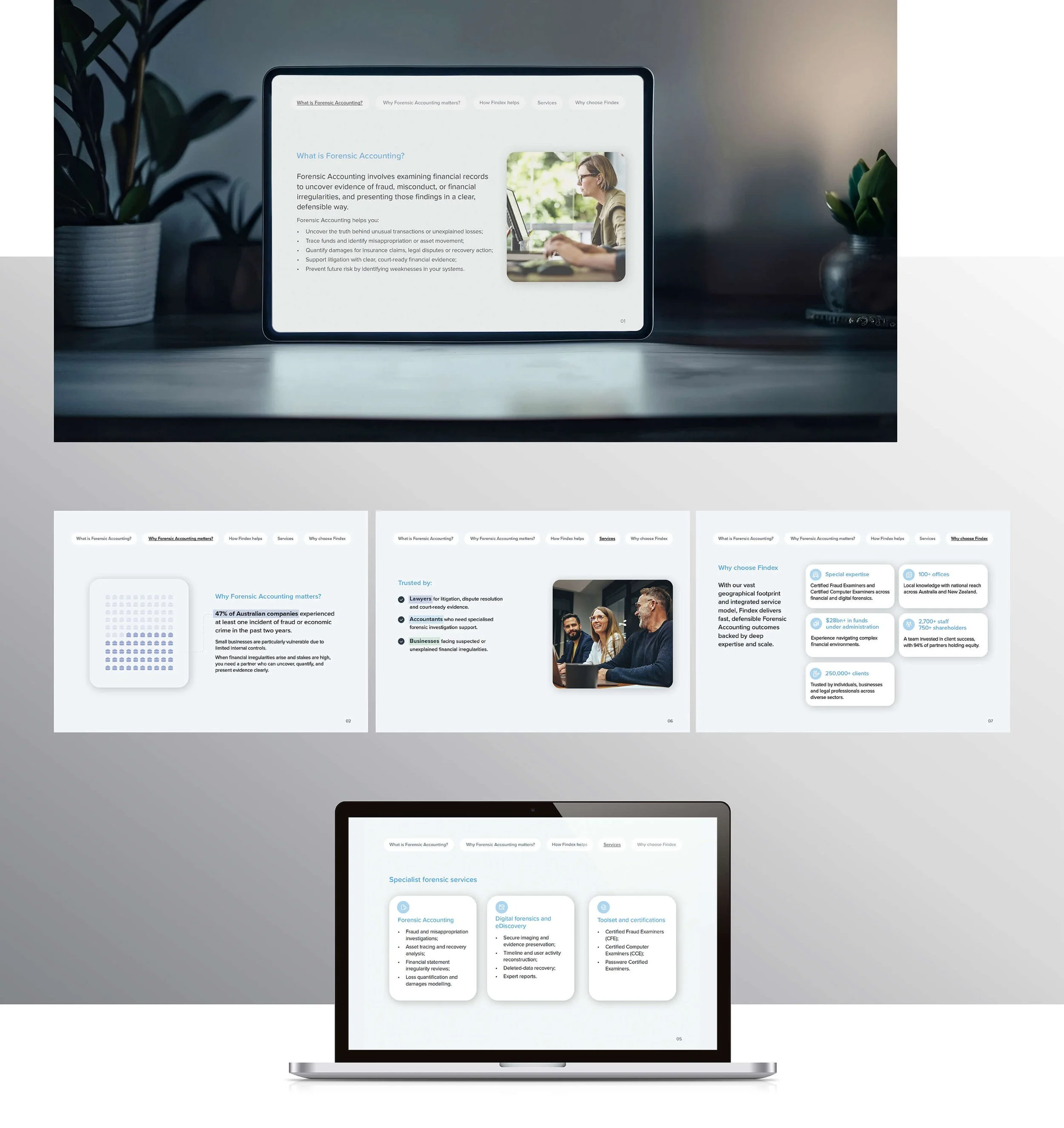 This project creates a self-directed journey through forensic accounting services, designed to inform, engage, and empower users without overwhelming them.