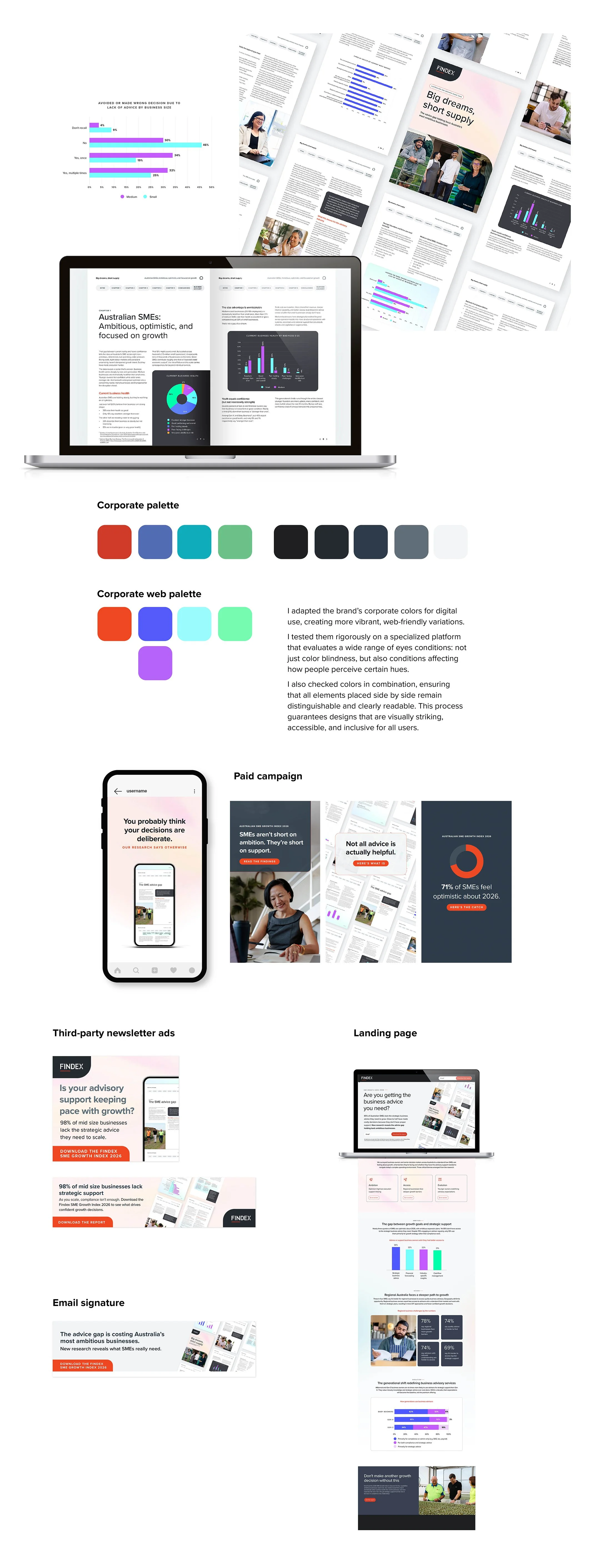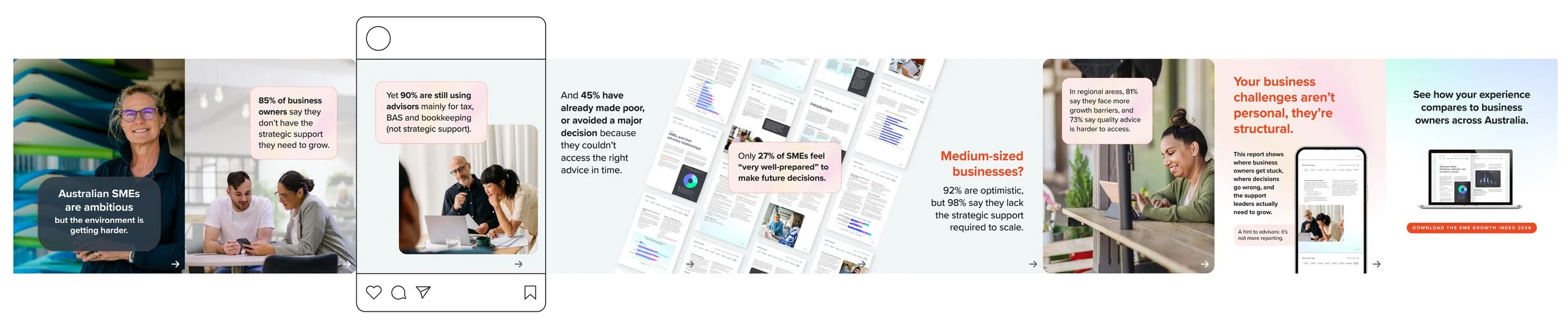 The SME Index report highlights that Australian businesses are ambitious but often lack the strategic guidance they need to make confident growth decisions, with compliance support alone no longer enough. For this report rollout, I am leading the UX/UI design of the interactive PDF and developing all campaign assets, including internal materials (desktop backgrounds), external communications (EDMs, infographics), the landing page, and social media campaigns. Social media content is being designed with a performance-based approach across both paid and organic channels, complemented by animations to boost engagement and visibility. By translating complex insights into user-focused, visually engaging experiences, the campaign is set to ensure the report reaches and resonates with its audience across multiple touch-points.