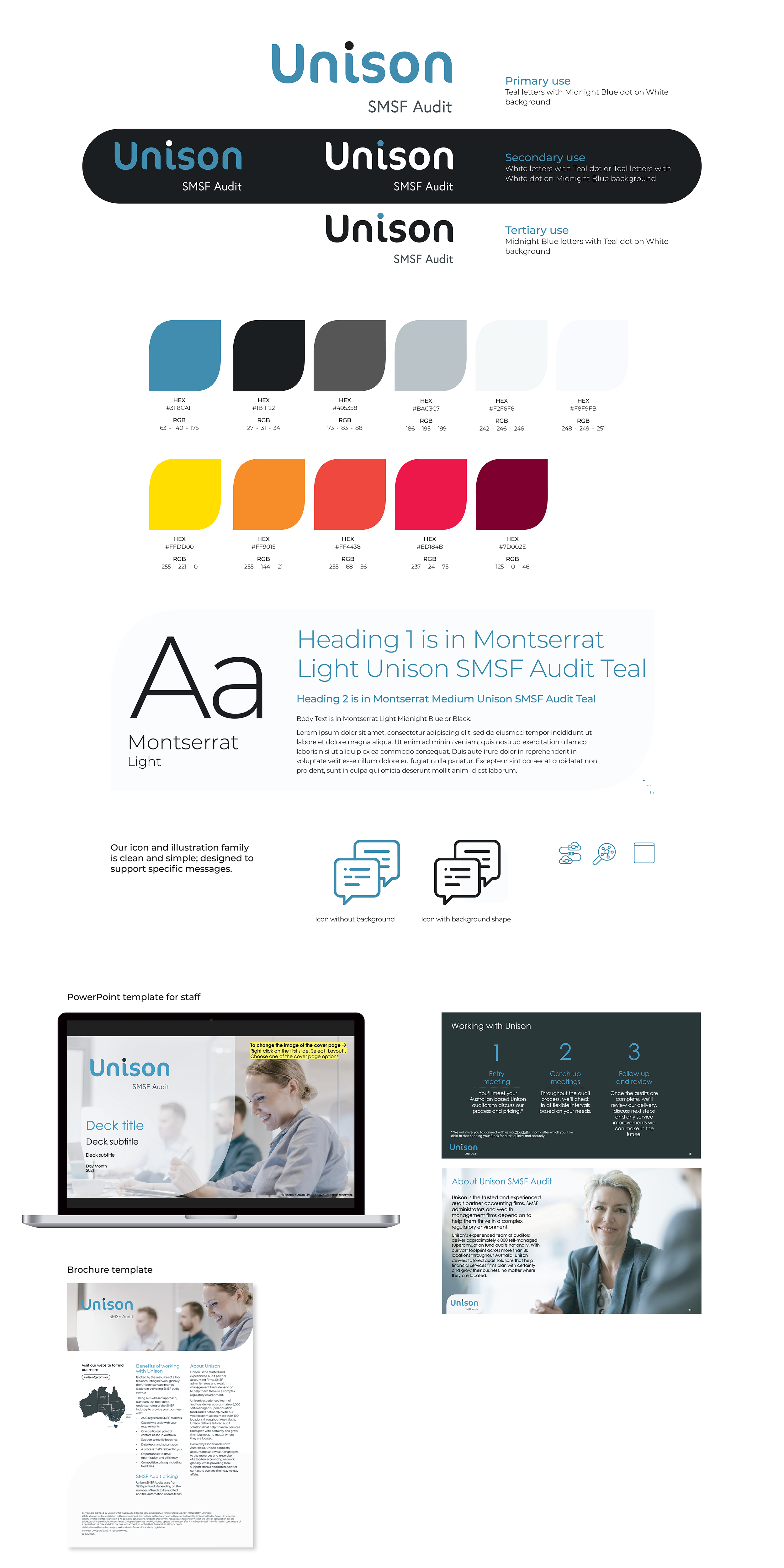 The visual identity was designed to communicate trust, clarity, and professionalism within a highly regulated environment. A confident, professional colour palette reinforces reliability and stability, while the rounded curves of the logo and graphic elements soften the visual language, making the brand feel more approachable, human, and partnership-driven. This balance between structure and softness reflects Unison’s positioning as both a technical expert and a trusted advisor.